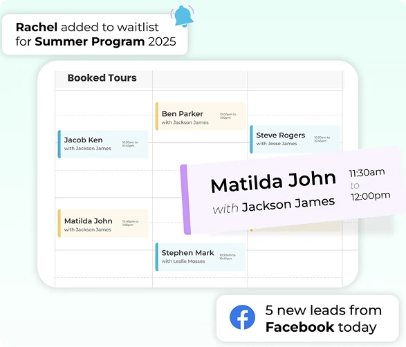 Lupakan pengurusan pelbagai sistem: di luar pengurusan pertanyaan, uruskan semua operasi penjagaan anak utama seperti penjejakan kehadiran, pelaporan perkembangan kanak-kanak, pengebilan dan perakaunan, dan pengurusan pelbagai pusat-semuanya dari satu papan pemuka. Penglihatan 360 darjah ini memastikan anda boleh membuat keputusan yang tepat di seluruh operasi pusat anda.